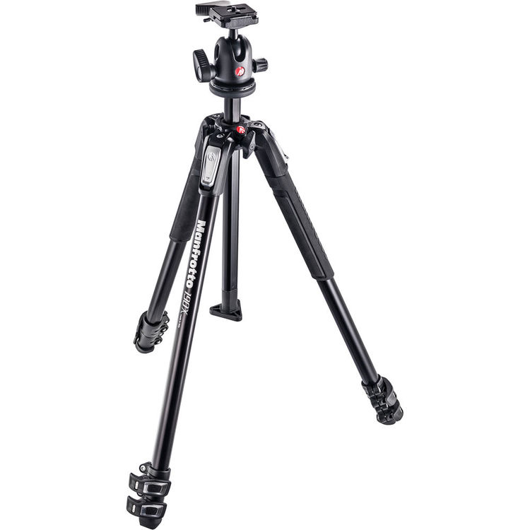 The Manfrotto MK190X3-BH Aluminum Tripod includes the 496RC2 compact ball head and a quick release plate. This tripod is an addition to the popular 190 series, adding a Quick Power Lock System, ground level adapter, and an Easy Link attachment. It can hold up to 13.2 lb of gear, and has a maximum height of 67″. The ground level adapter replaces the center column to allow the ball head’s plate to sit just 7.5″ above the ground with the legs at their widest angle.