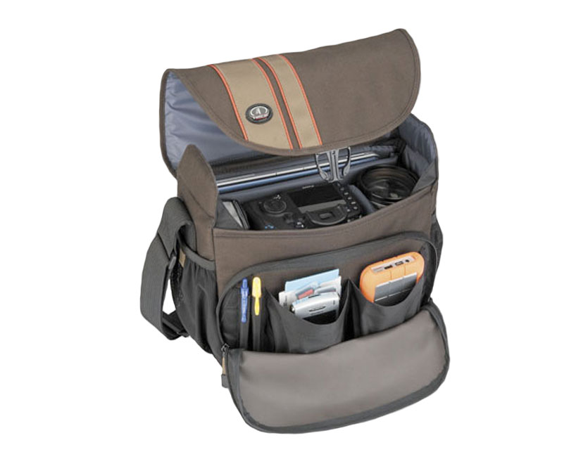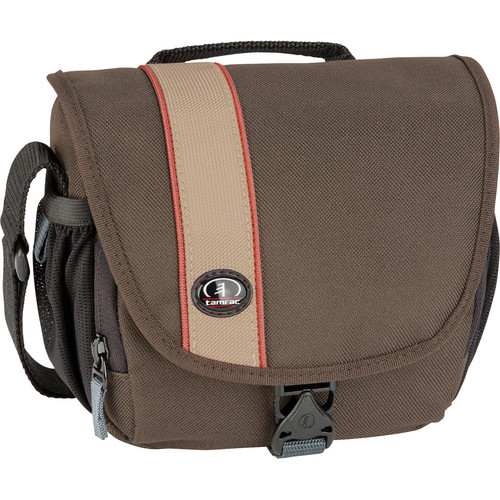 The brown/tan 3440 Rally Micro Camera Bag from Tamrac is a compact camera bag that holds a mirrorless camera, two lenses (one attached) and a small flash. Although minimalist in design, it contains features that make it a very viable and functional shooting bag.