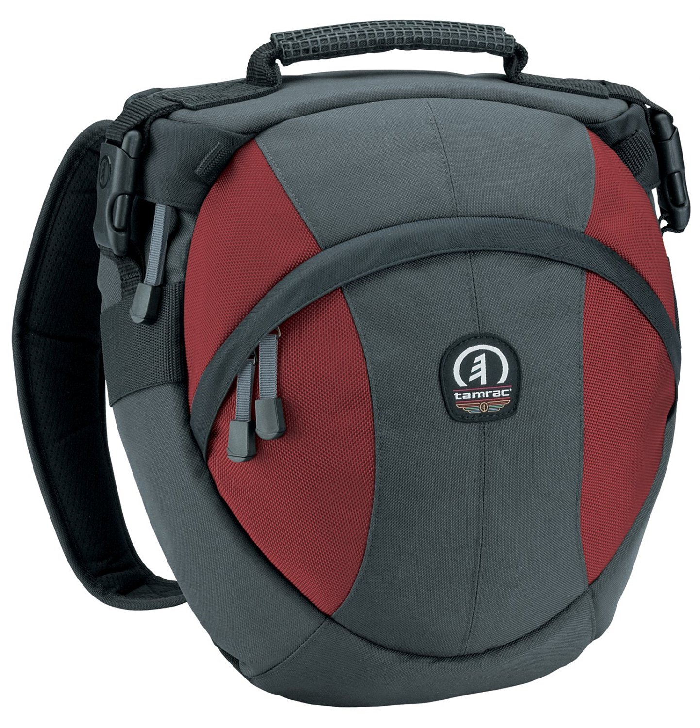 - The Velocity 8x Pro Sling Pack holds a pro DSLR with a grip (such as Canon’s 5D Mark II or Nikon’s D700) and an 8″ zoom lens attached, two extra lenses and a flash. Inside the main compartment, the camera with lens attached is suspended on two vertical, foam-padded dividers that are internally reinforced with rigid plastic. The Velocity 8x can be carried comfortably like a backpack, but when swung around to the front, the secure zippered Quick Flip Top opens away from the body for fast and convenient access to camera gear. A well-padded sling strap comfortably distributes the weight, but need not be removed to quickly access photo equipment. A Tuck-A-WayTM waist belt allows the Velocity 8x to be used comfortably during vigorous activities such as hiking or biking. The front pocket has organizer pockets inside to keep a mobile phone, PDA or photo accessories within easy reach. It also features Tamrac’s US-patented Memory & Battery Management SystemTM that uses red flags to identify available memory cards and batteries from ones that are used up. A pocket inside the lid stores filters and lens caps. Customize this sling pack with Tamrac’s Modular Accessory SystemTM components.