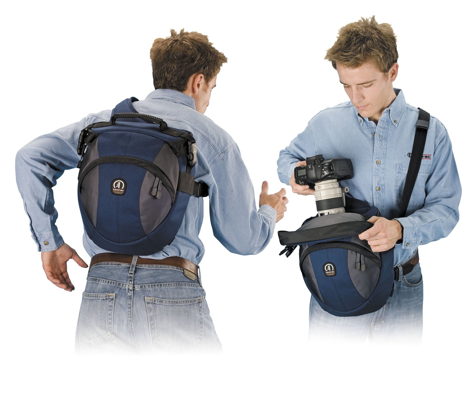 The Velocity 8x Pro Sling Pack accommodates a pro DSLR with a grip (such as Canon’s 5D Mark II or Nikon’s D700) and an 8″ zoom lens attached. Inside the main compartment, the camera with lens attached is suspended on two vertical, foam-padded dividers that are internally reinforced with rigid plastic. The Velocity 8x can be carried comfortably like a backpack, but when swung around to the front, the secure zippered Quick Flip Top opens away from the body for fast and convenient access to camera gear. A well-padded sling strap comfortably distributes the weight, but need not be removed to quickly access photo equipment. A Tuck-A-Way waist belt allows the Velocity 8x to be used comfortably during vigorous activities such as hiking or biking. The front pocket has organizer pockets inside to keep a mobile phone, PDA or photo accessories within easy reach. It also features Tamrac’s US-patented Memory & Battery Management System that uses red flags to identify available memory cards and batteries from ones that are used up. A pocket inside the lid stores filters and lens caps. Customize this sling pack with Tamrac’s Modular Accessory System components.