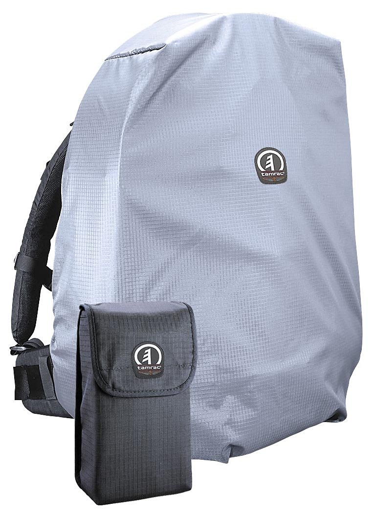 The gray with black MX5352 M.A.S. System Medium Rain Cover from Tamrac is made to fit some of the Tamrac back packs. The Tamrac photo backpacks are made from water-proofed materials and have giant rain flaps, so in general, they don’t require a rain cover.