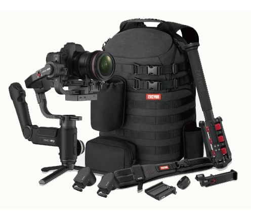 In addition to the accessories that come standard with the Crane 3-Lab, such as a mini tripod, the Master Package also includes a quick release baseplate, telescopic monopod, multifunctional gimbal bag, focus/zoom servo kit, two quick setup adapters, a phone holder, and a multifunctional camera belt in size large.